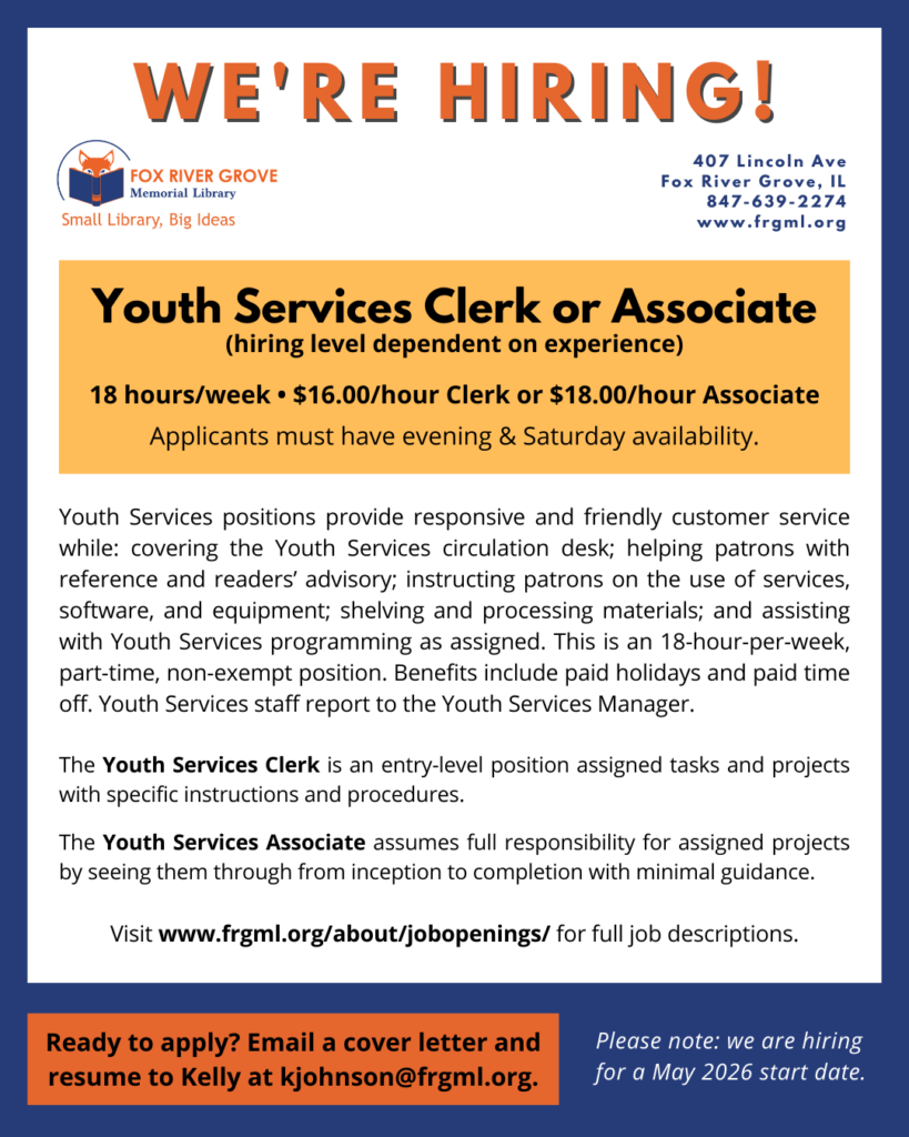 Youth Services positions provide responsive and friendly customer service while: covering the Youth Services circulation desk; helping patrons with reference and readers’ advisory; instructing patrons on the use of services, software, and equipment; shelving and processing materials; and assisting with Youth Services programming as assigned. We are currently hiring for an 18-hour-per-week, part-time, non-exempt position. Benefits include paid holidays and paid time off. Youth Services staff report to the Youth Services Manager.